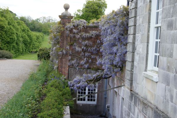 | Was nicht passt, wird passend gemacht. Die Wisteria hat man halt über den Graben gezogen, damit sie an der Wand hochklettern kann. |